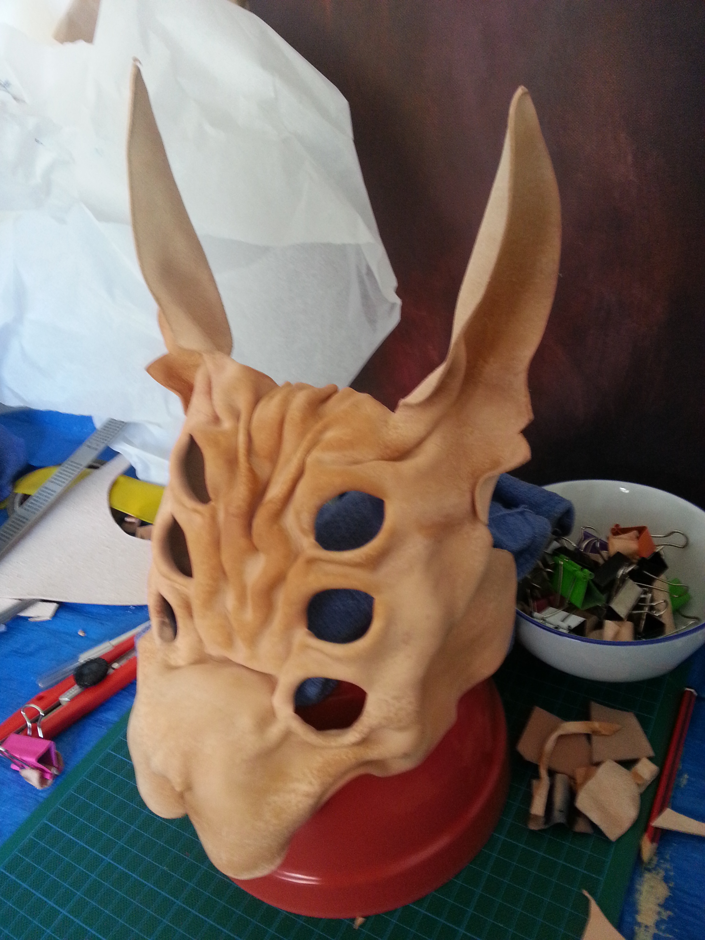 Using the same technique as the dog mask; the back is clipped with bulldog clips to hold the creases in place, as the leather is gradually shaped and dried. **Pro Tip! Use extra leather scraps between the leather and the clip to avoid damage or staining to the surface.**