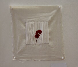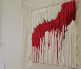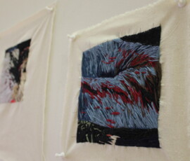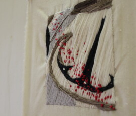 Ladies Lounge (2017) is an installation and ongoing project that explores women’s bodies as sites of trauma for the purpose of entertainment in genre films. The series is in commemoration of those women “slain in battle” and is presented as a series of tapestries with accompanying video installation. Each image is the aftermath of an act of violence, with each victim female. By distilling each act down into static stitched frames the images are confused and abstracted. While violence against women is often fetishised on screen, it is worth noting that genre films (particularly Horror) have often been responsible for placing women in unconventional roles, way ahead of mainstream film. The time consuming method reflects the sycophantic execution of these scenes while pulling into question the slippery dichotomy of “women’s work” and the roles we play as victims, perpetrators and heroes.